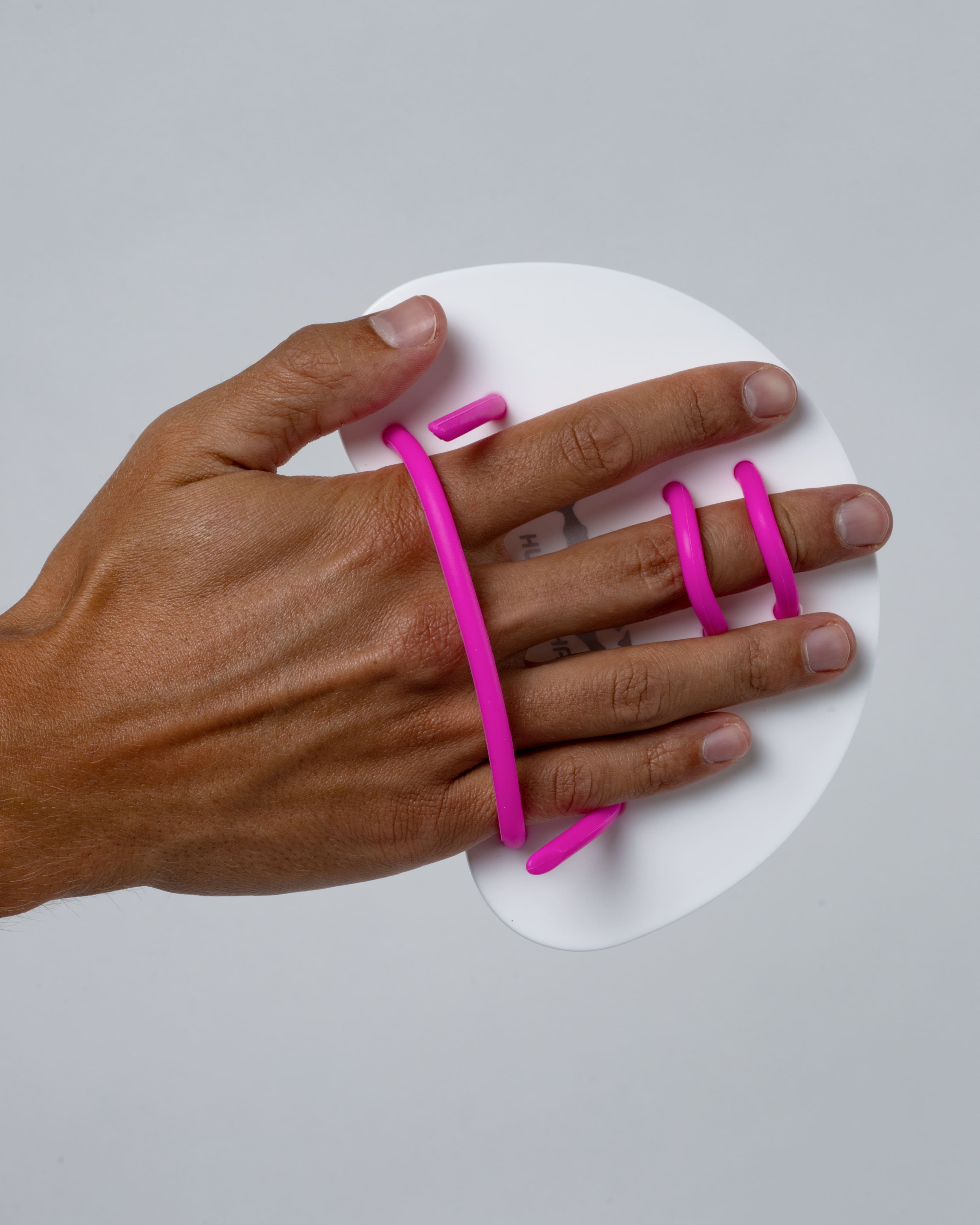 Su sistema de gomas ajustables aporta una sujeción cómoda y estable, adaptándose a distintos tamaños de mano. El acabado en color rosa con el logo HumanShark le da un estilo distintivo y motivador.