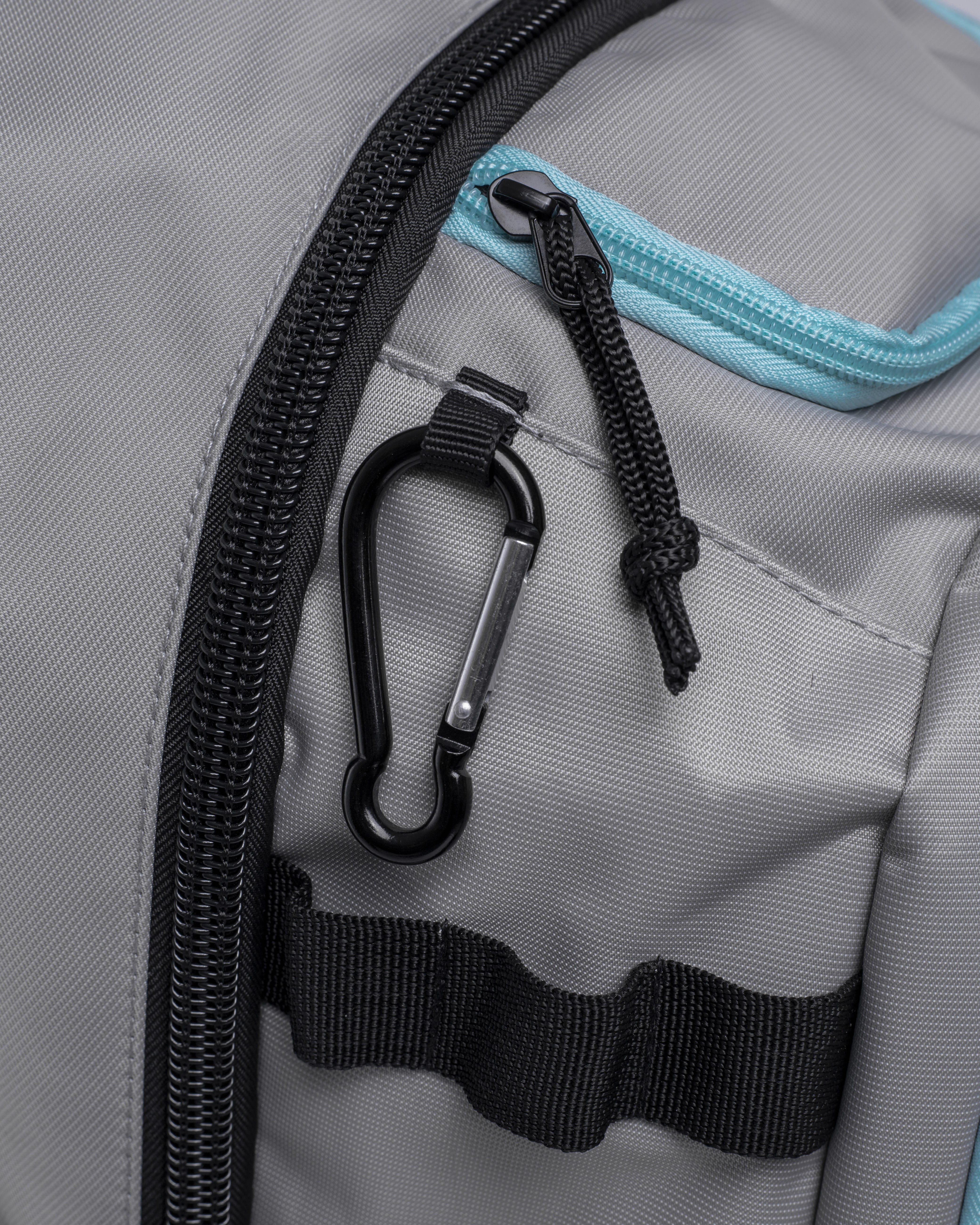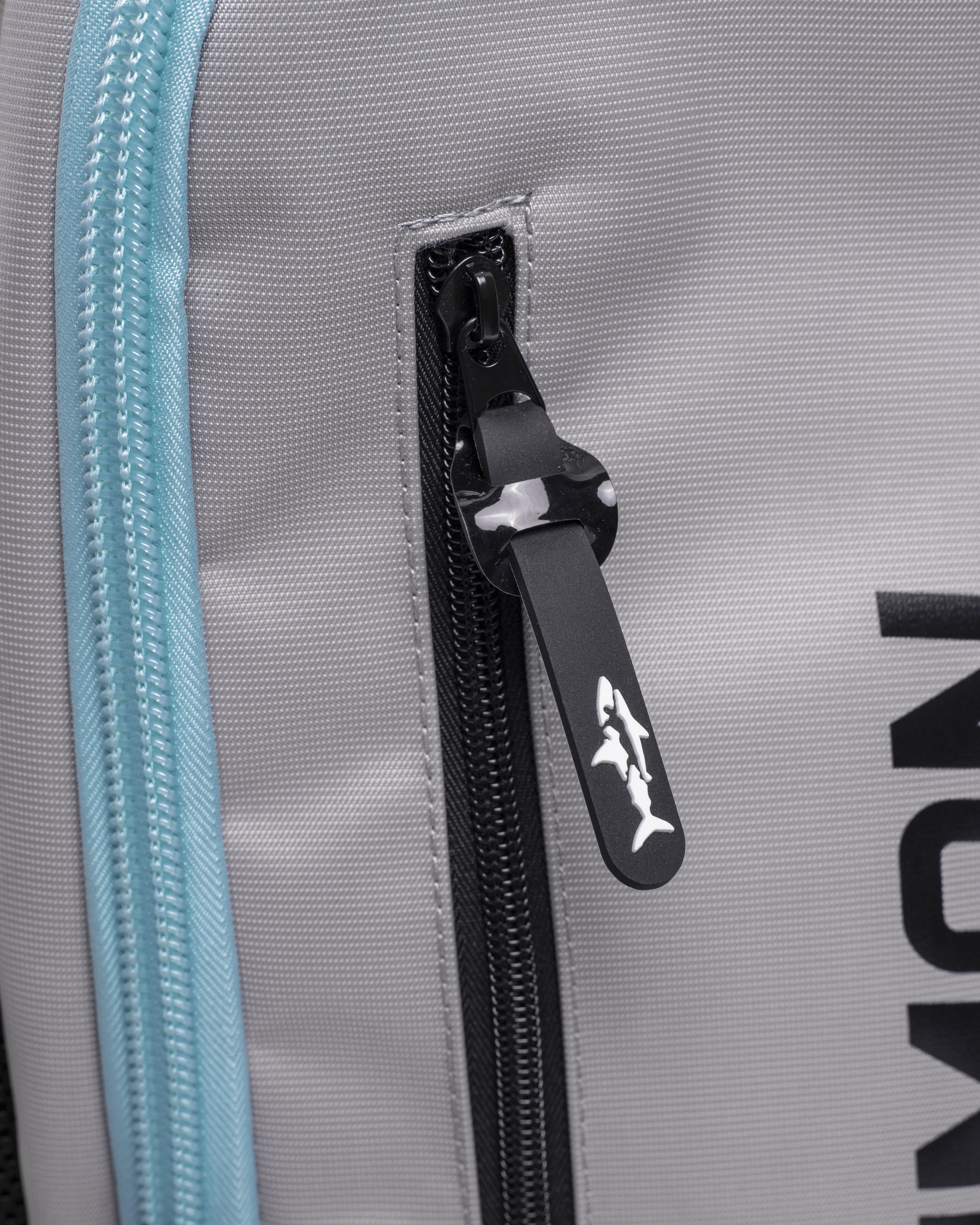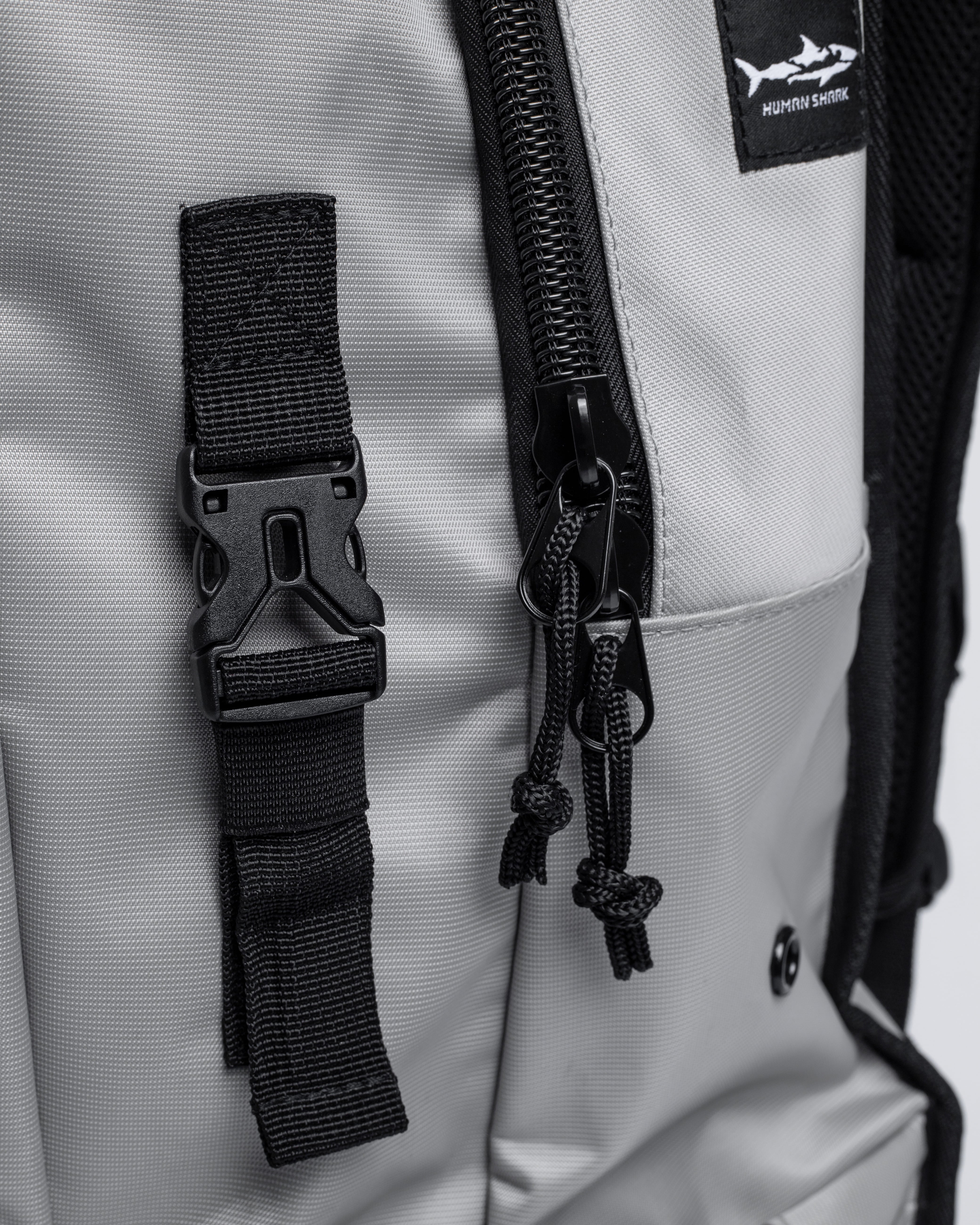 Detalles exclusivos Human Shark: Cremalleras personalizadas con el logotipo y mosquetón lateral para accesorios.